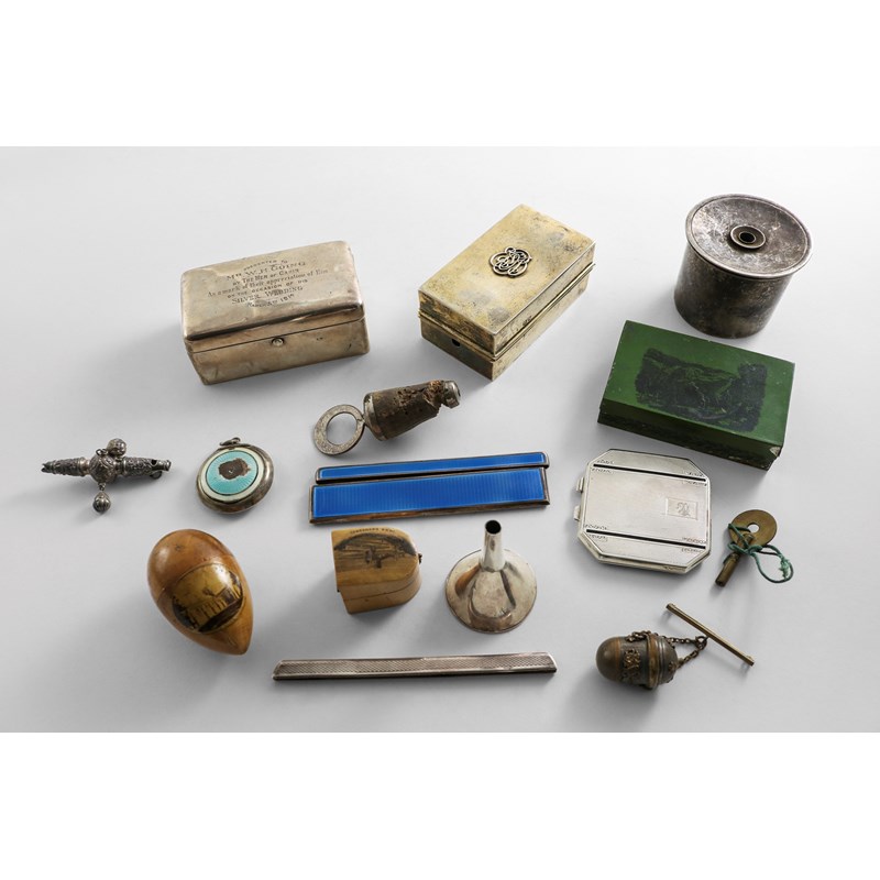 A 19th century Swiss painted tin musical box with a printed view of Meyringen on the cover, a George III Irish burner (probably from a kettle), a compact, a rattle, two Mauchline-ware boxes, an Old Sheffield plated funnel, two boxes, etc.; the musical box 3.6" (9.2 cms) long (lot)