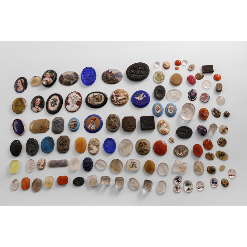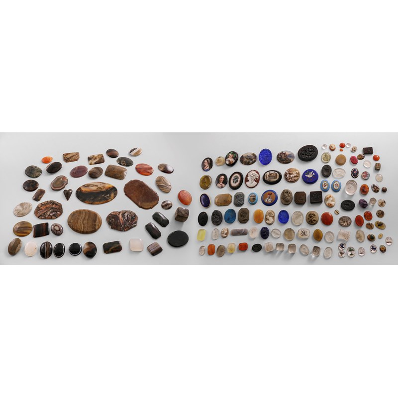 A LARGE QUANTITY OF POLISHED AGATE PANELS glass & hardstone cameos, reverse painted crystals, porcelain plaques, three micromosaics, etc. (lot)
