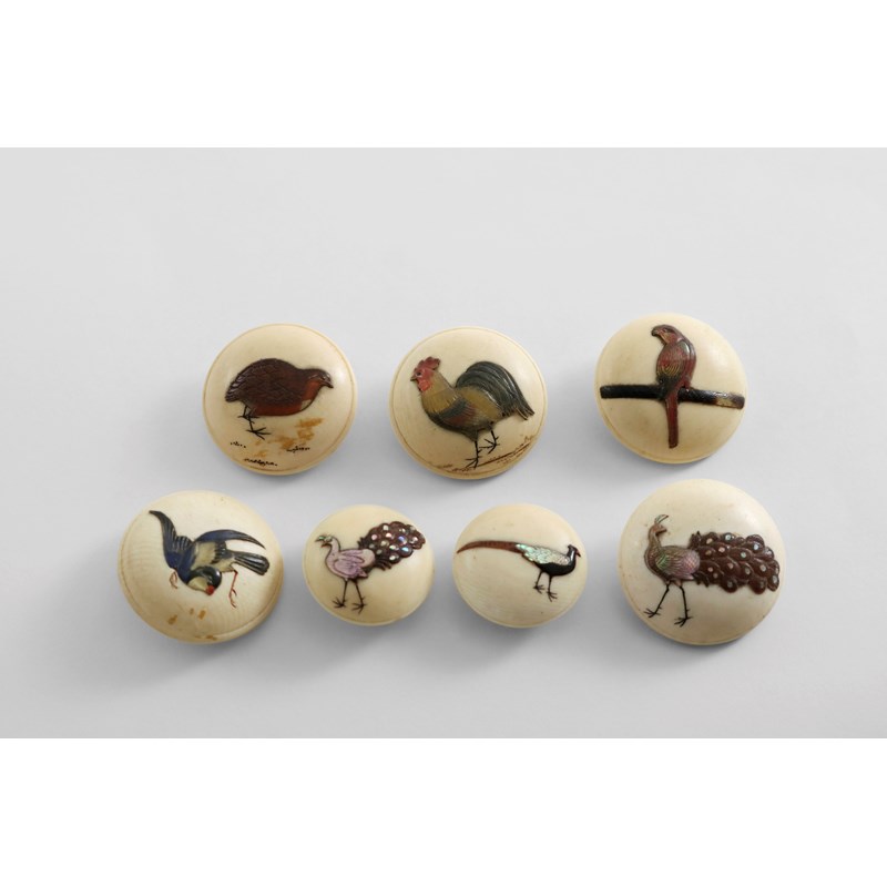 SHIBAYAMA BUTTONS Seven Japanese ivory buttons inlaid with different birds; five 3 cms, two 2.25 cms
