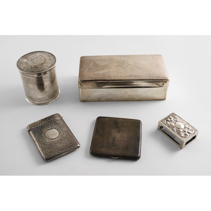 A rectangular cigarette box with a low-domed cover, monogrammed, by Joseph Braham, London 1911 (wood lining), a card case with a hammered finish, initialled, a small match box cover, an engine-turned cigarette case by Sampson Mordan & Co., London 1932 and an Egyptian cylindrical box & cover; the latter 3.5" (9 cms) high; 12.9 oz weighable silver (5)