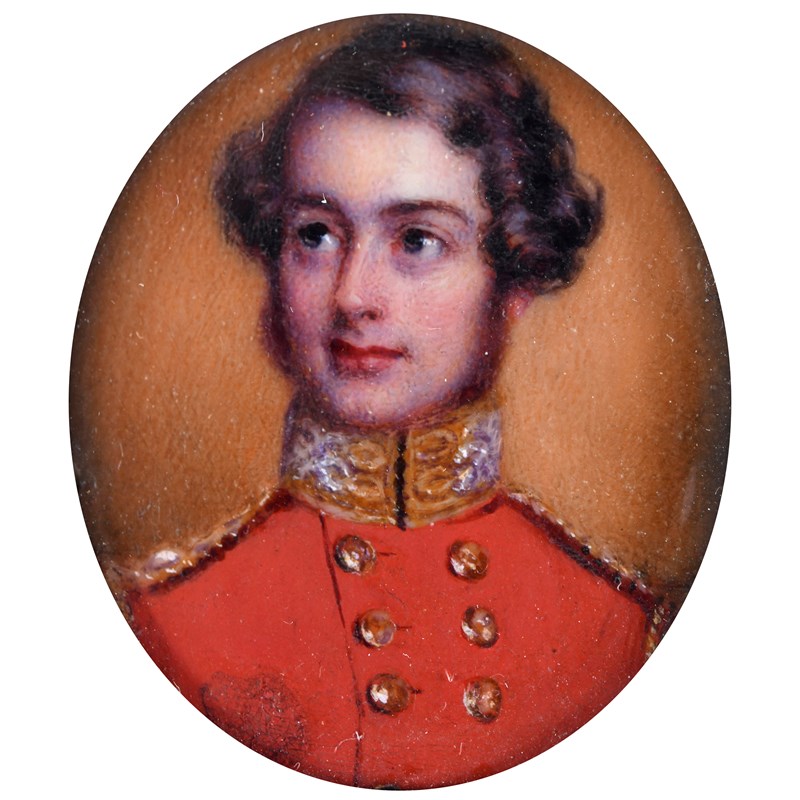 HENRY COLLEN Miniature portrait of an officer of the Scots Fusilier Guards c.1820, wearing red coat, on ivory; 3.5 x 3 cms