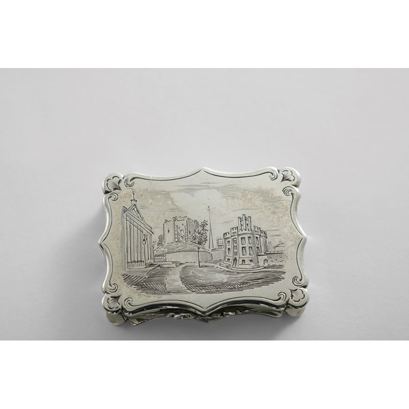 of shaped rectangular outline with a view of York, featuring the Court House and railings on the left, Clifford's Tower in the back centre ground, next to the crenellated Tudor Gothic gate house of the prison at York Castle, also visible in the background are St. Helen's Church tower and St. Mary's church spire, the base with engraved scrolls, initialled "HW", gilt interior, by Nathaniel Mills, Birmingham 1842; 1.8" (4.6 cms) long; 1 oz