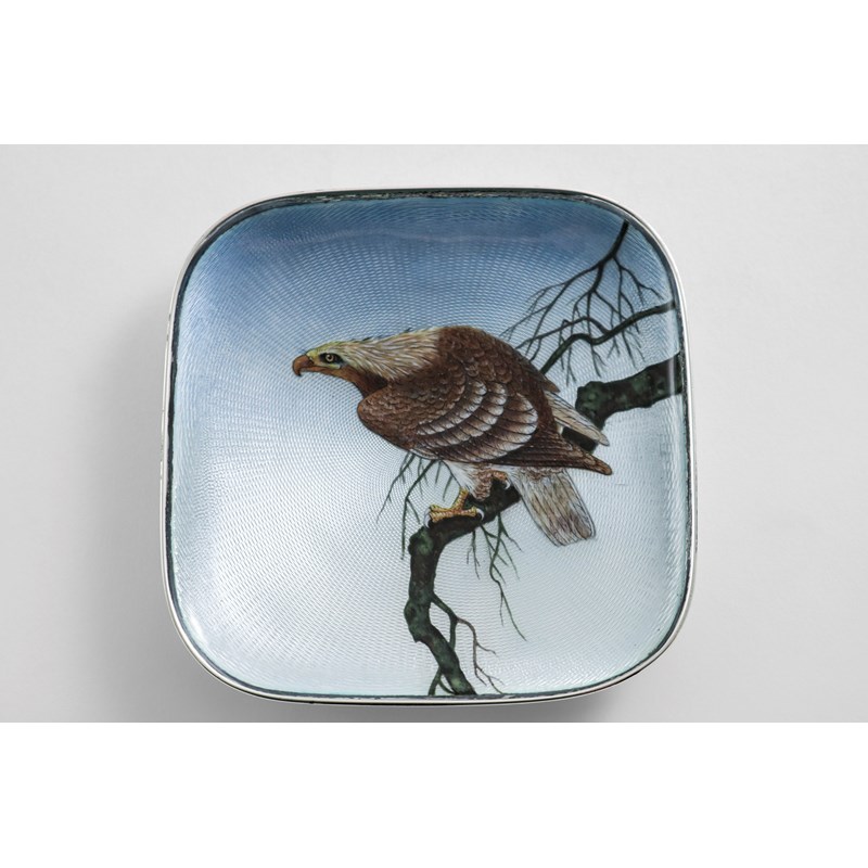 of square outline with rounded corners and a collet foot, decorated in the centre with an eagle on a branch against a silvery blue sky ground, by Erich Kellerman, with English import marks for London 1911; 3.95" (10 cms) square; 4.1 oz