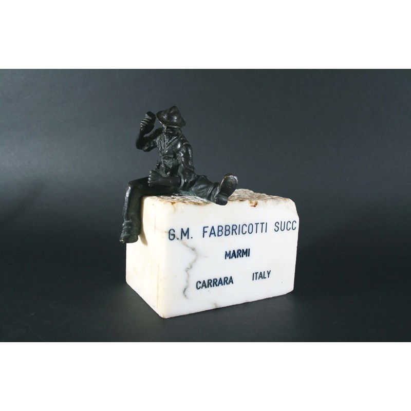 a bronze figure of a Miner, seated on a block of marble. Marked on the marble, G M Fabbricotti Succ, Marmi, Carrara, Italy. 7ins (18cms) high overall