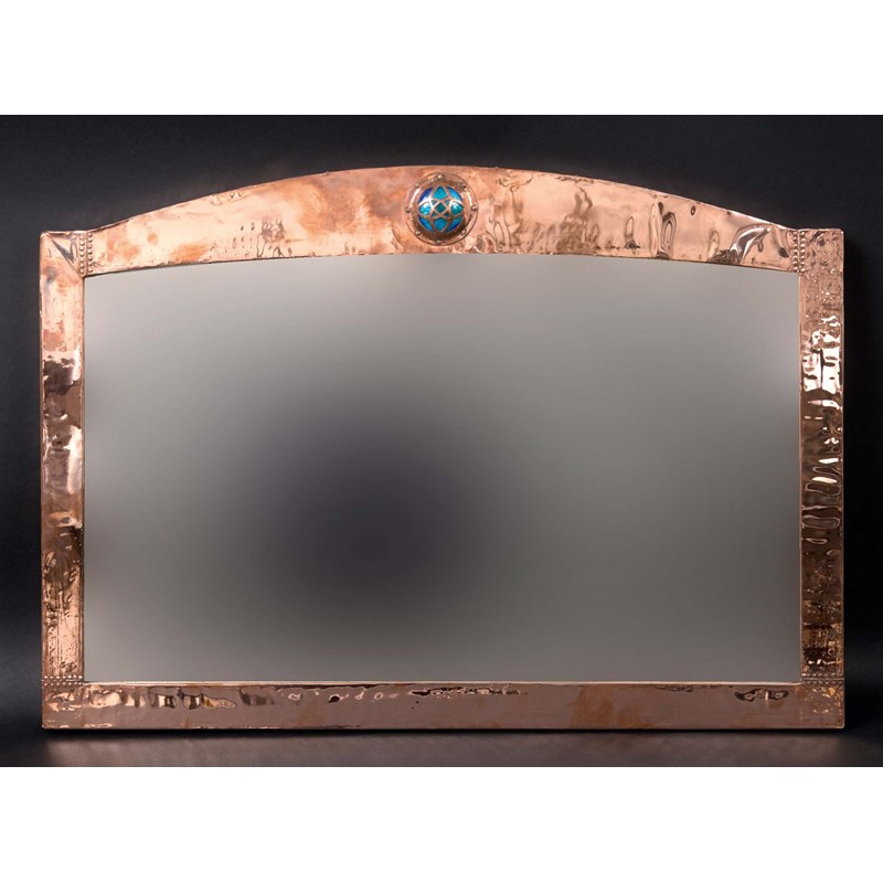 a copper mirror inset with an enamel roundel and simulated rivets. With a bevelled glass plate and wooden backboard. 27 1/2ins (70cms) across, 19 3/4ins (50cms) high