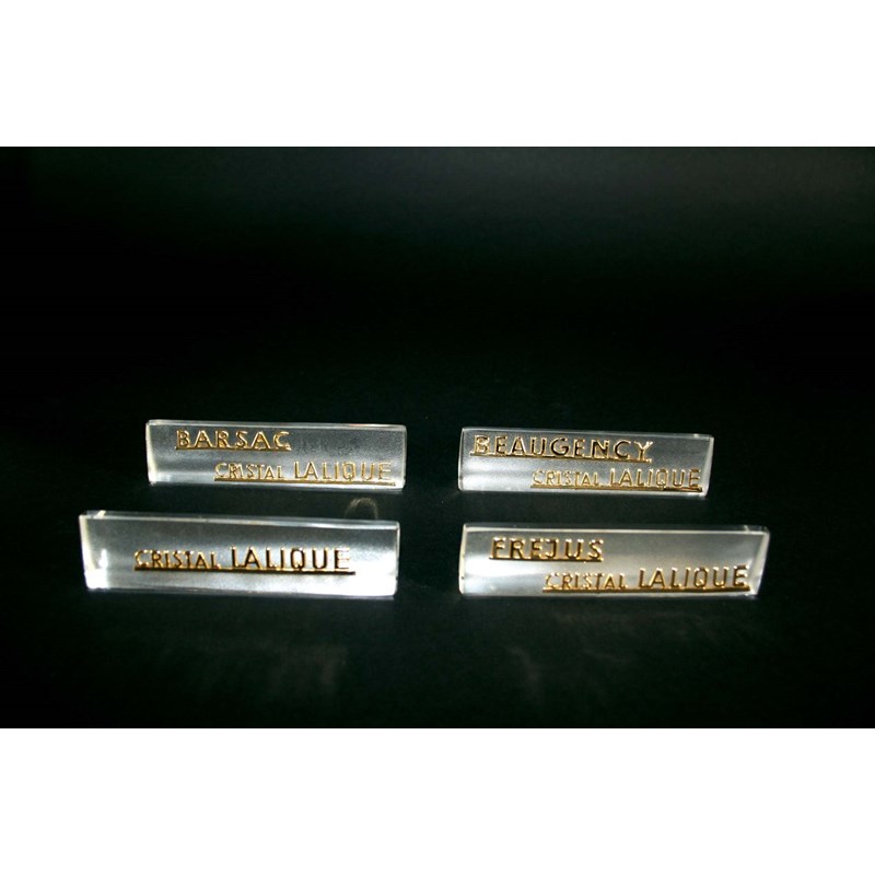 LALIQUE ADVERTISING SIGNS 4 small frosted glass signs, for Barsac Cristal Lalique, Frejus Cristal Lalique, Beaugency Cristal Lalique, and Cristal Lalique. Each 4 1/4ins (11cms) across