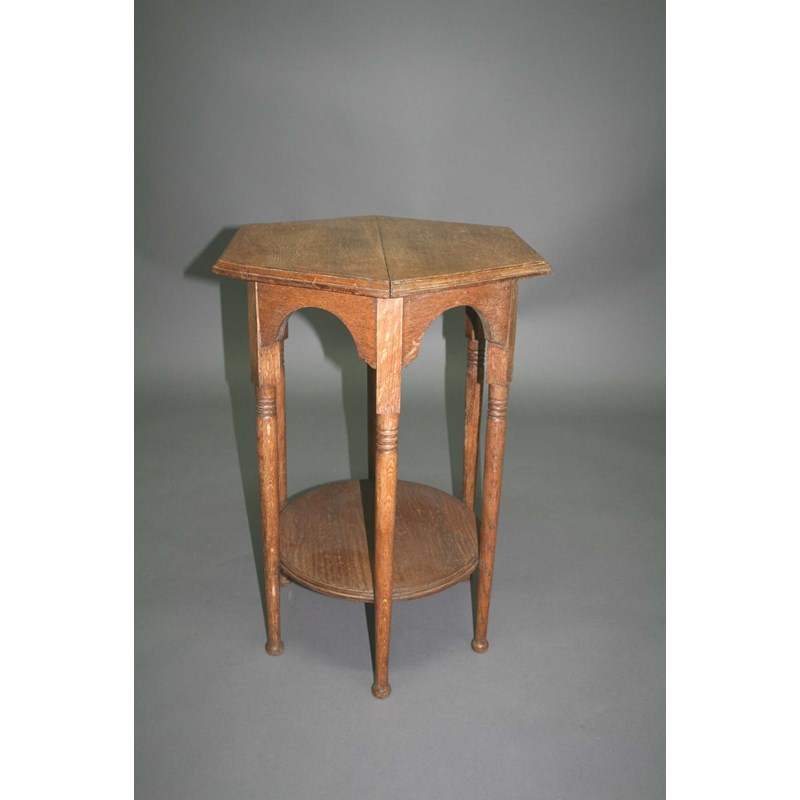 an oak occasional table probably retailed by Liberty & Co, with a hexagonal top and supported on turned legs. 29ins (73cms) high