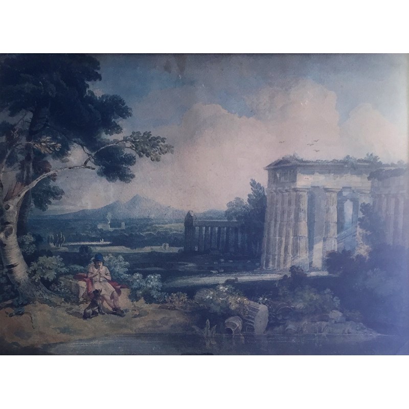 ATTRIBUTED TO JOSHUA CRISTALL (1767-1847) SHEPHERD BOY AND A DOG BY RUINS IN A CLASSICAL LANDSCAPE Watercolour 32.5 x 44cm.