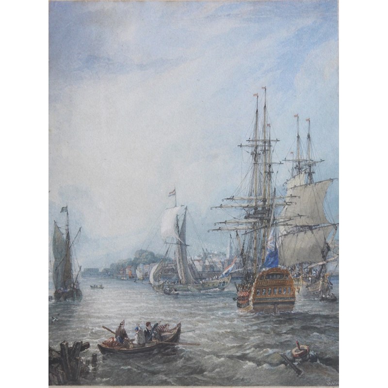 SAMUEL OWEN (1768-1857) FRIGATES, SAILING VESSELS AND SMALL CRAFT IN COASTAL WATERS Signed, watercolour with pen and ink over pencil 20.5 x 15.5cm.