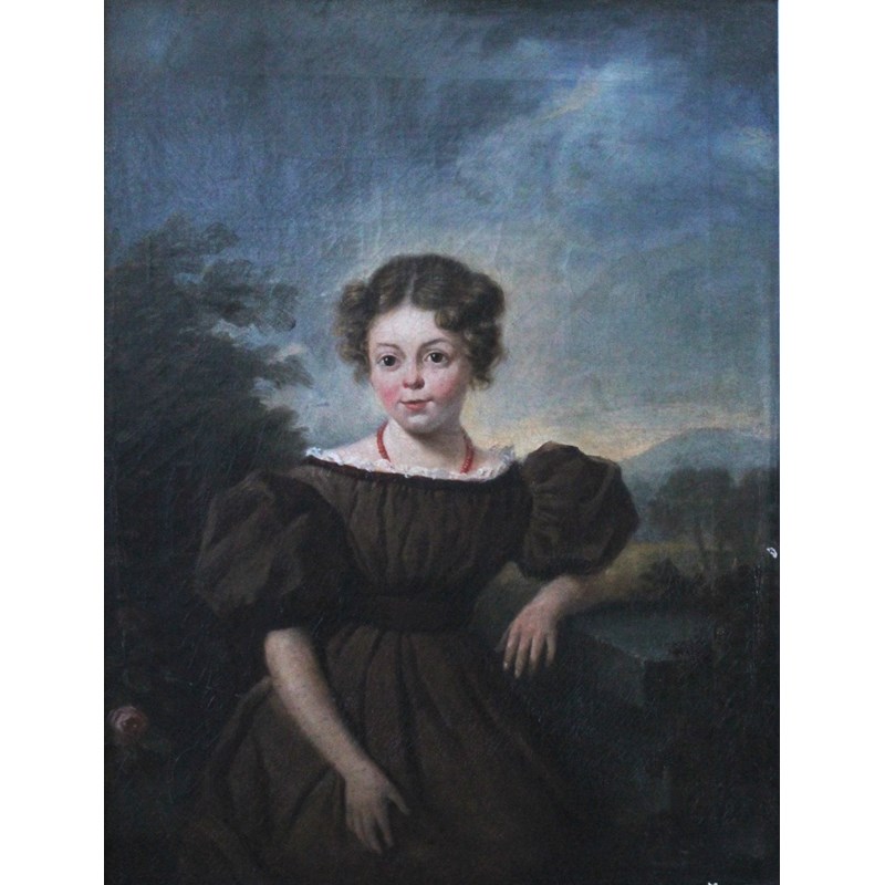 ENGLISH SCHOOL, mid-19th CENTURY PORTRAIT OF A YOUNG GIRL Half length, wearing a brown dress and a coral necklace, oil on canvas 44.5 x 33.5cm.