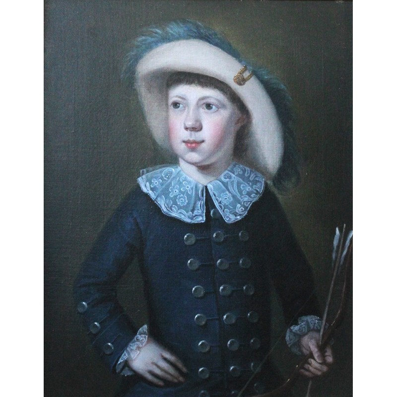 CIRCLE OF BARTHOLOMEW DANDRIDGE (1691-c.1755) PORTRAIT OF A BOY Standing half length, wearing a blue tunic, lace collar and cuffs and a blue plumed hat, holding a bow and arrows, oil on canvas 59.5 x 47cm.