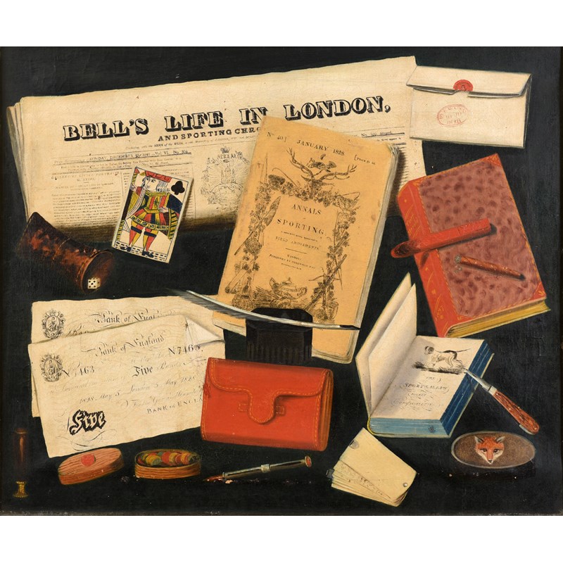 showing Bell's Life in London, Annals of Sporting 1828, The Sportsman's Pocket Companion, two £5 notes, a letter, a wallet, a dish of gaming counters, a cigar, an ivory notebook, cup and dice, a playing card and a quill pen etc