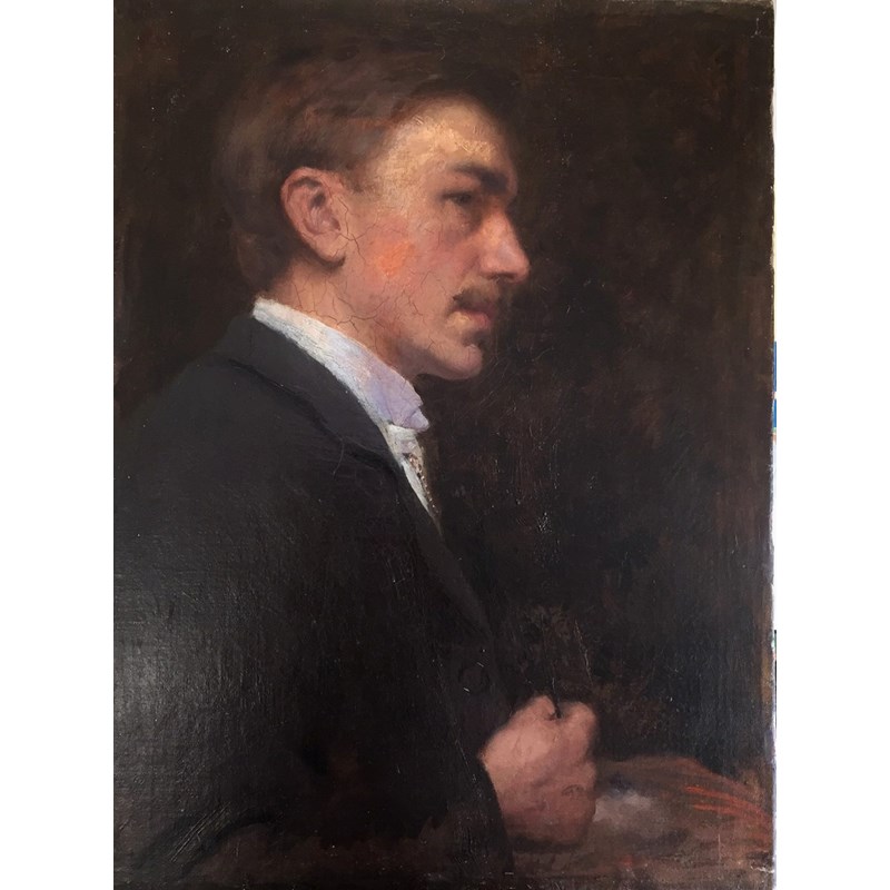 FOLLOWER OF JOHN DA COSTA (1867-1931) PORTRAIT OF A GENTLEMAN Quarter length, wearing a grey/brown coat, holding a brush or pen, oil on canvas, unframed 50.5 x 38cm.