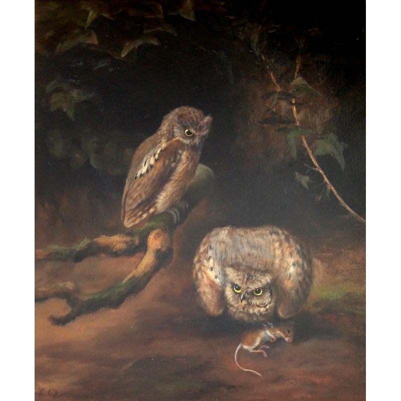 F** L** Q** (Circa 1880-1900) THE OWLS' PREY Signed with initials, oil on board 43 x 35cm.