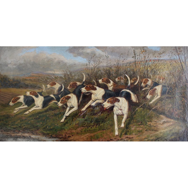 CIRCLE OF CUTHBERT BRADLEY (1861-1943) HOUNDS ON THE SCENT Oil on canvas, unframed 34 x 66.5cm.