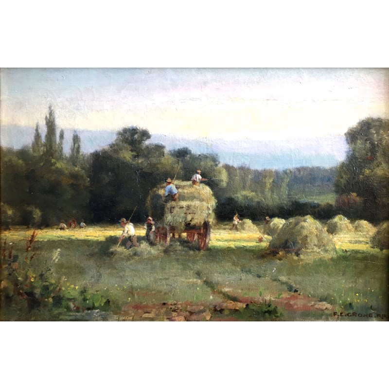 FERDINAND E. GRONE (c.1845-1920, Fl.1888-1919) HAY MAKING Signed, oil on canvas 28.5 x 43.5cm.