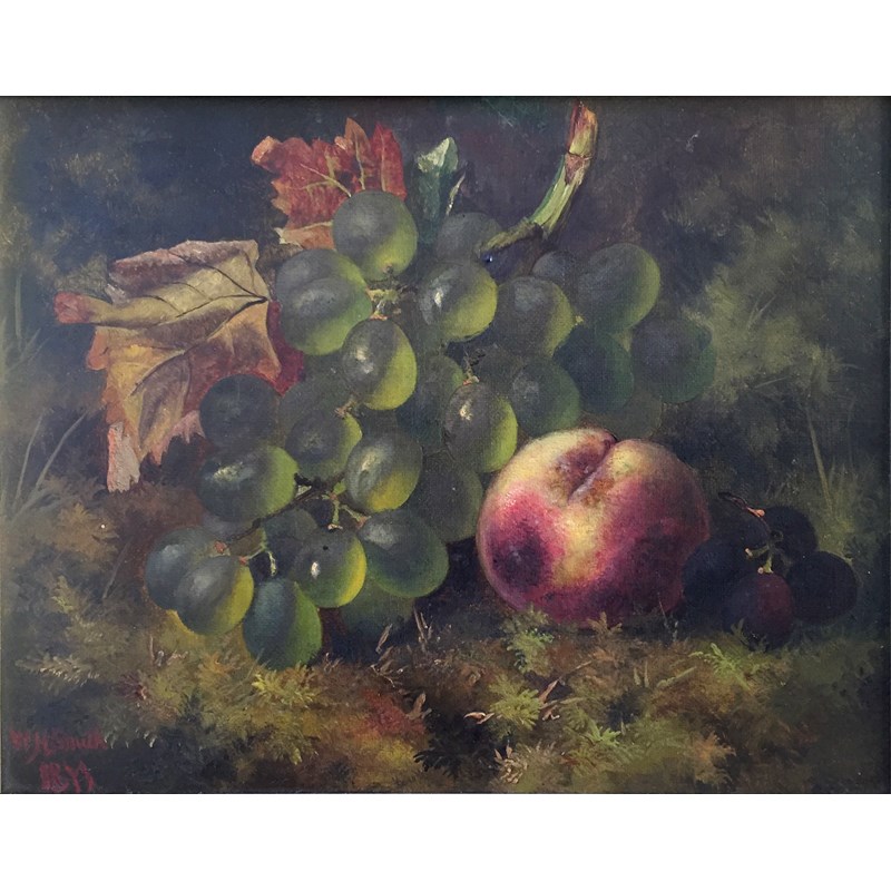 WILLIAM H. SMITH (Fl.1863-1880) STILL LIFE OF GRAPES AND A PEACH UPON A MOSSY BANK Signed and indistinctly dated, oil on canvas 19 x 24cm.