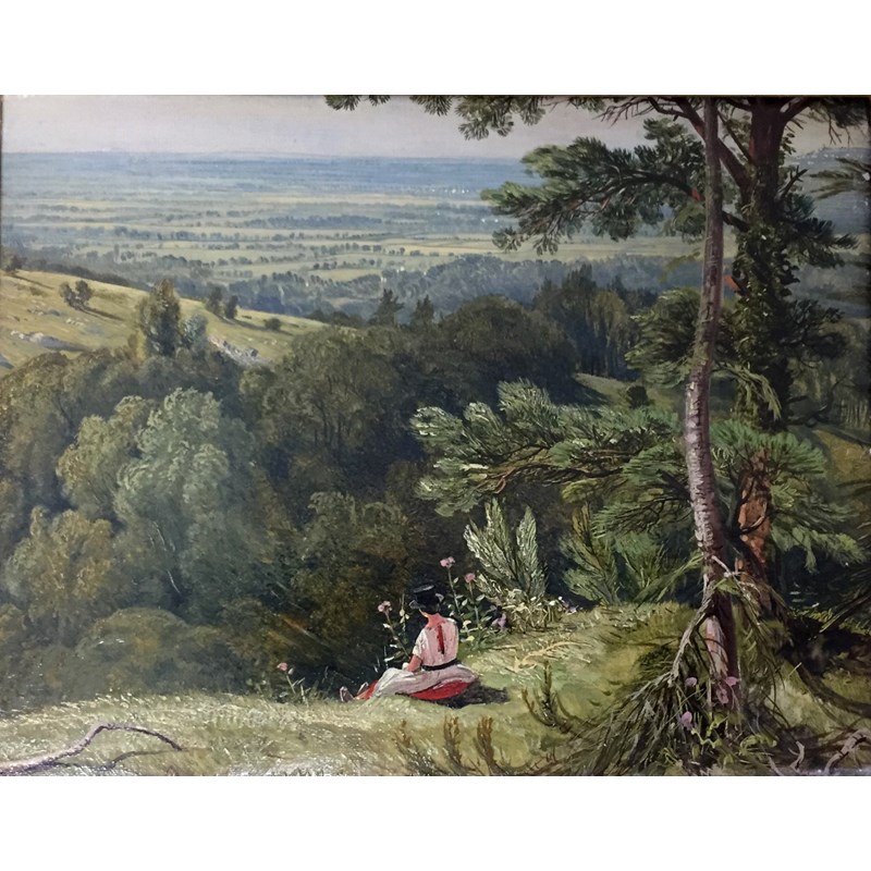 H** HEWITT (Fl.1845-1870) LADY SEATED ON A SUNNY BANK ABOVE A COUNTRY LANDSCAPE Oil on canvas 23 x 29.5cm.