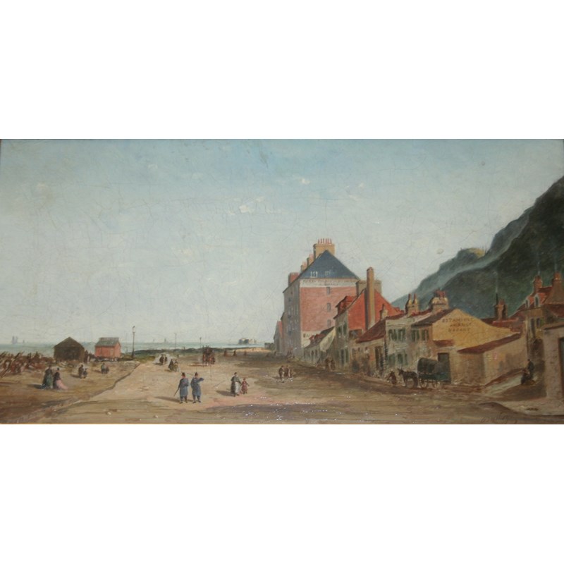PIERRE DULHOYA (Fl.c.1870-1900) SOLDIERS AND FIGURES ON A FRENCH STREET, POSSIBLY DUNKERQUE Signed, oil on canvas 17.5 x 33.5cm.