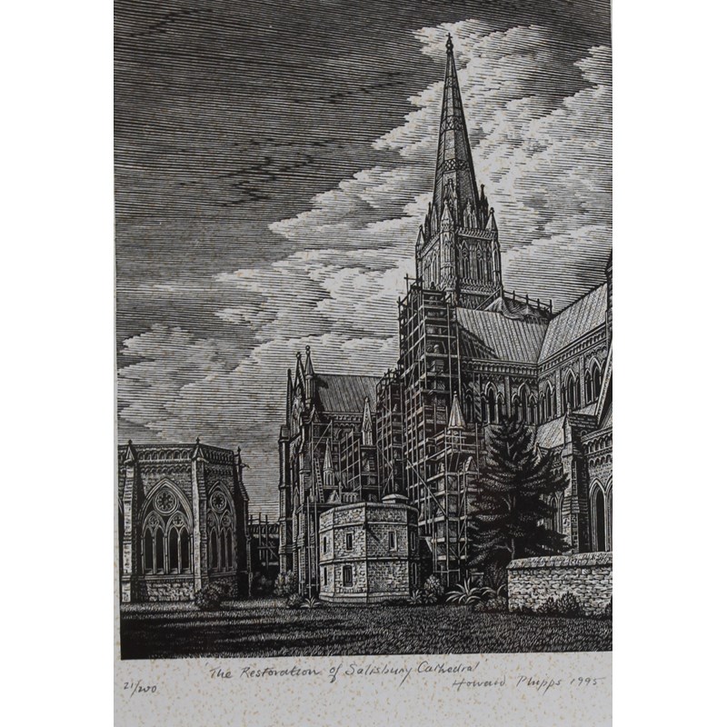 to include examples by Howard Phipps (`The Restoration of Salisbury Cathedral` and `Chilcombe`); Peter S. Smith (`Leaving`); Claire Dalby (`Penmon Priory`, `Heytor, Shetland`, `Durham Cathedral` and `Byre at Fladderbister`); Edward Stamp (`Regents Canal`); Sarah van Niekerk (`North Leigh from Wilcote`); A. Froggatt (`Conservatoire`); Peter Reddick (`Foundry at Welsh Quarrying Museum, Llanberis`); and three further works, each signed and numbered from editions of 25 to 200, 1980-1995, various sizes (14)