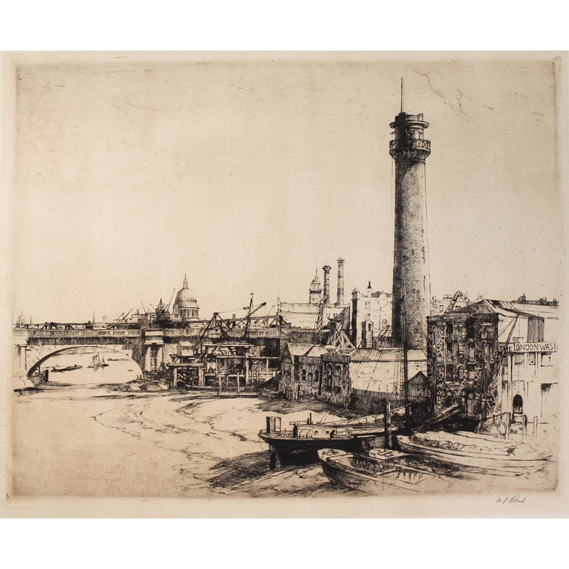 to include `Porto Maggiore, Orvieto` and `Old Deal` by Sir Henry Rushbury, 1925 and 1920, both signed, 19.5 x 23.5cm., 17 x 18cm.; `Waterloo Bridge and The Shot Tower` by William Palmer Robins, signed and titled, 26.5 x 33cm.[see illus.]; `Cornish Fishing Village` by Margaret M. Rudge, signed and titled, 22.5 x 25cm.; and `Brick Carts, Deptford` by Edgar Wilson, signed and titled, 6.75 x 8cm., all unframed (5)