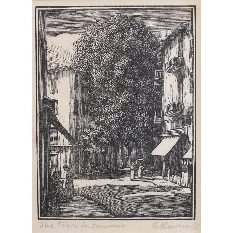 to include `The Town in Summer` by Gwen Raverat, c.1924, signed and titled, 10 x 7.5cm. [see illus]; `Dress: 1860` `Xenia Noelle Lowinsky` (reproduction) and `Cat with Flaming Tree` by Eric Gill, 1921, c.1931; `Llanthony Priory` by Edgar Holloway, 1948, signed, titled, dated and numbered 4/30, 7.5 x 12.5cm.; `Hambledon Hill` by Howard Phipps, signed, titled and numbered 123/150, 11.5 x 15cm.; `The British Library` by Anne Desmet, 2nd ed., signed, titled and numbered 4/25, 14 x 12.5cm., all unframed (7)