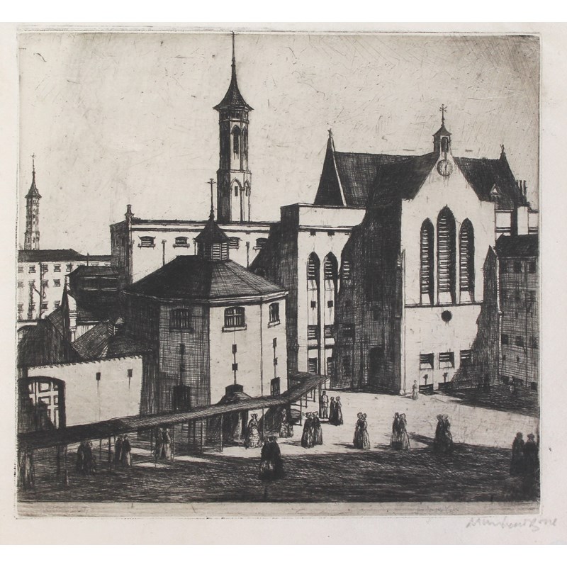 to include the rare `Watkins' Airing Yard` by Sir Muirhead Bone, 1903, signed, with title, 15 x 16cm.[see illus.]; `Egham` and `Thames Fishermen no.1` by Sir Francis Seymour Haden, 1859-1865 and 1859, the latter an early proof of the penultimate state, 12.5 x 20cm and 14.5 x 21.5cm; and `San Rufino, Assisi` by R. T. Cowern, 1938, signed, unique impression of 4th state, 15.5 x 20cm., all unframed (4)