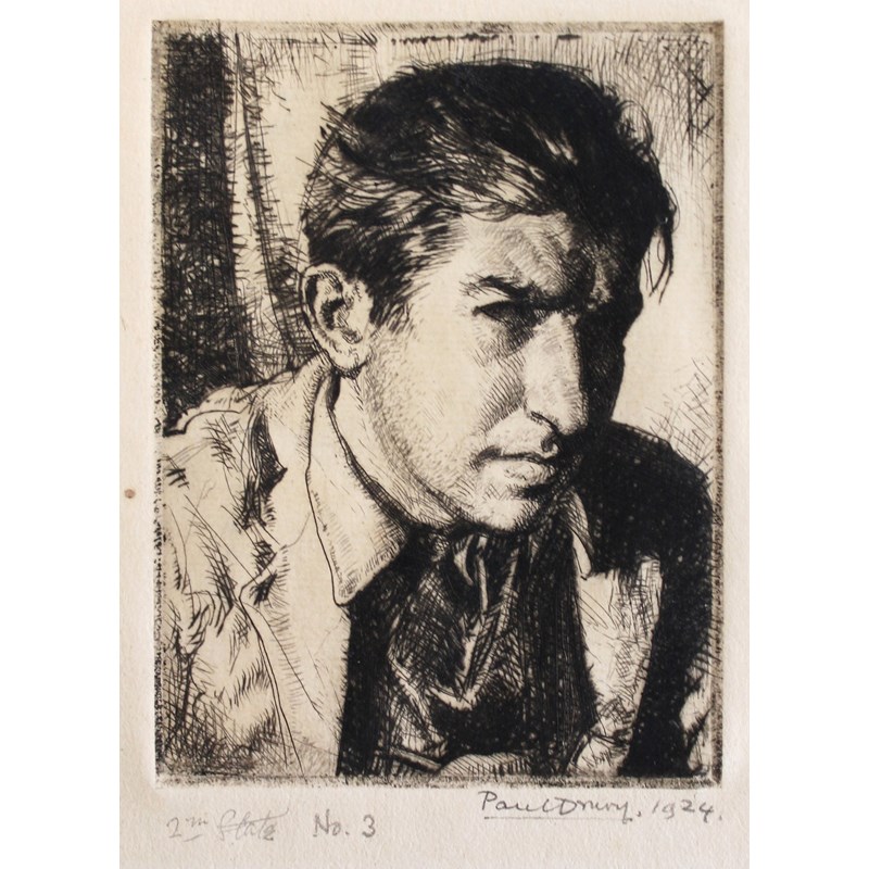 to include `Self Portrait by Lamplight` by Paul Drury, 1924, signed and dated, 9.5 x 7cm.[see illus]; `David Drummond Bone` by Francis Dodd, 1910, one of 18 proofs, signed, 20 x 25cm.; `Dawning Intelligence` by William Lee-Hankey, 1921, signed and titled, 27 x 23cm.; `The Rehearsal` by William Strang, 1889, rare proof by Frederick Goulding, signed and inscribed, 17.5 x 21cm.; and `Stockinger` by Mary Anne Sloane, c.1895, proof, 25 x 31cm., all unframed (5)