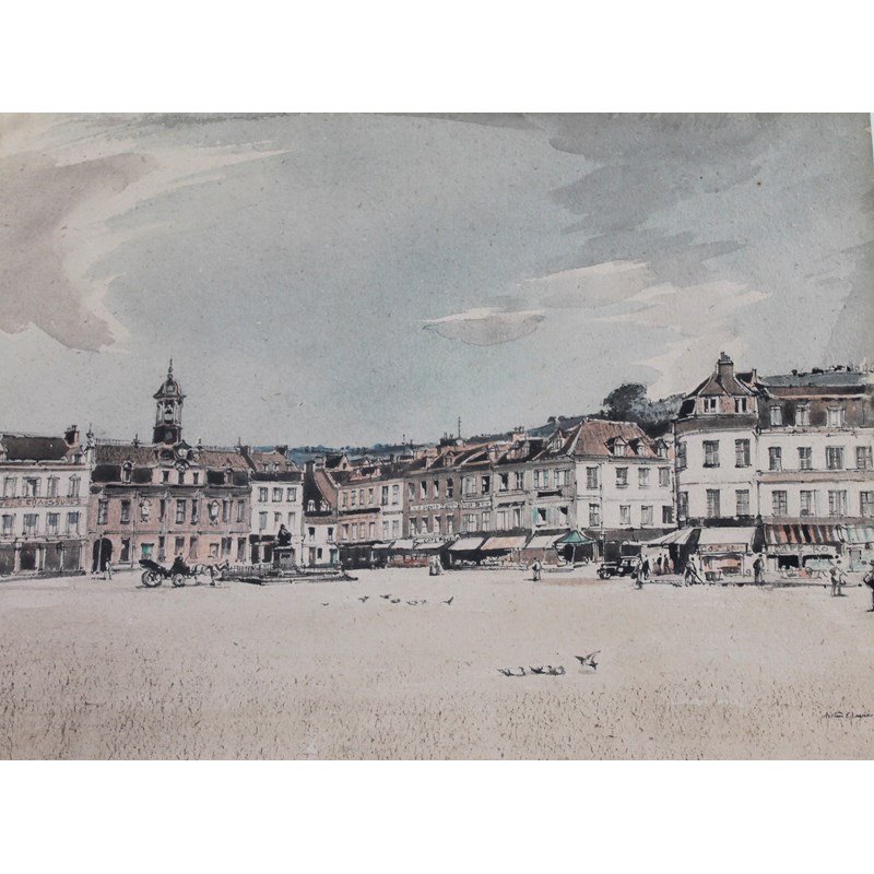 ‡ARTHUR E. DAVIES (1893-1988) A FRENCH TOWN SQUARE Signed, watercolour with pen and black ink 28.5 x 39.5cm.