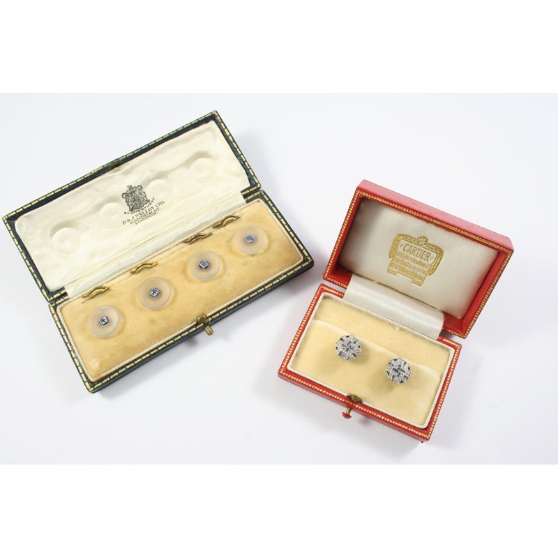 each set with calibre-cut sapphires and rose-cut diamonds, in 18ct white gold, together with a cased set of four crystal and sapphire dress studs