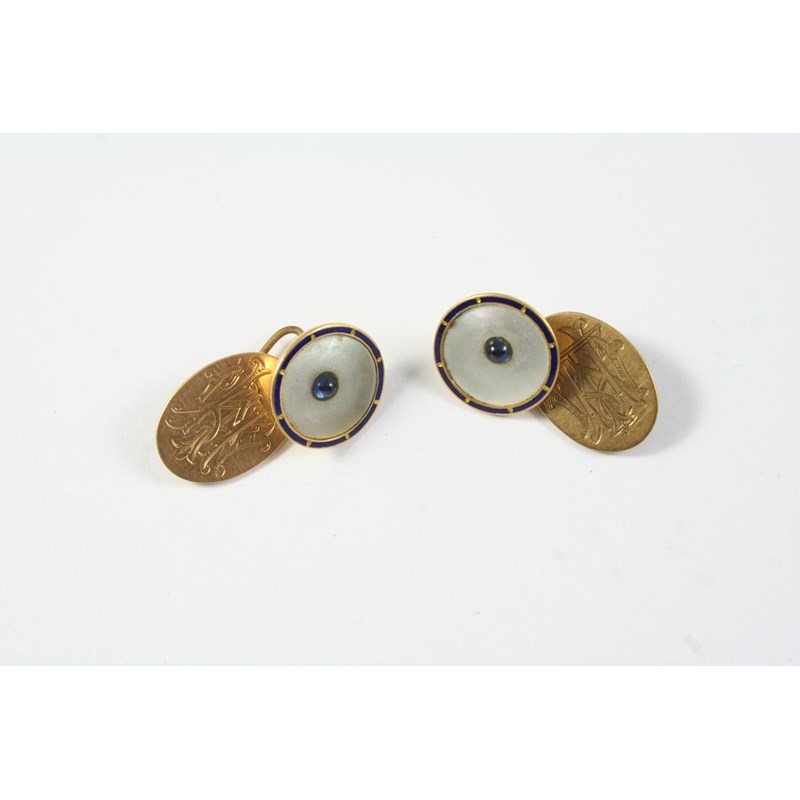 A PAIR OF MOTHER OF PEARL AND 15CT GOLD CUFFLINKS each formed with a circular mother of pearl link centred with a sapphire cabochon within a blue enamel border and an oval-shaped gold link engraved with initials, 7.4 grams