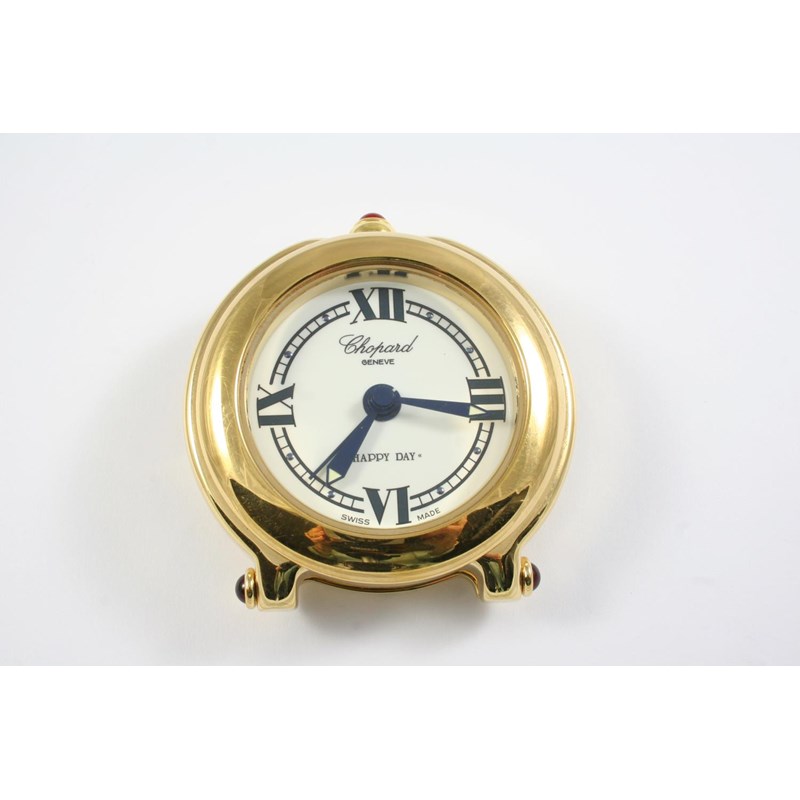 A GOLD PLATED HAPPY DAY ALARM DESK CLOCK BY CHOPARD the signed white dial with Roman quarters, numbered to the reverse 51/6137-21 943670, 7.8cm dia.