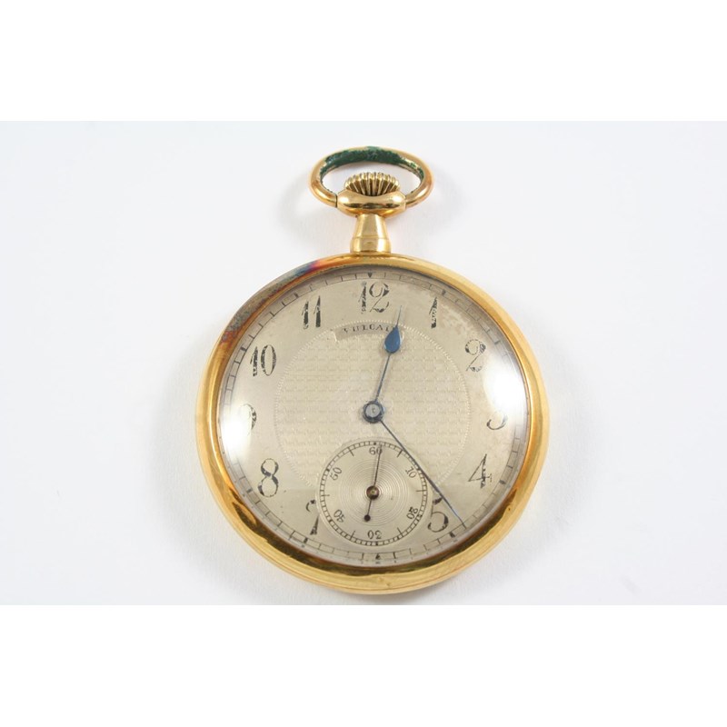 AN 18CT GOLD OPEN FACED POCKET WATCH the granulated dial with Arabic numerals and subsidiary seconds dial, 45mm dia., 52.6 grams