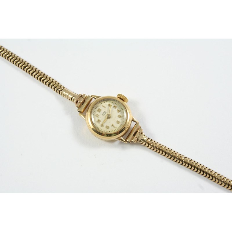 A LADY'S 9CT GOLD WRISTWATCH BY BENSON, LONDON the signed circular dial with Arabic numerals, on a 9ct gold snake link bracelet, 14.6 grams