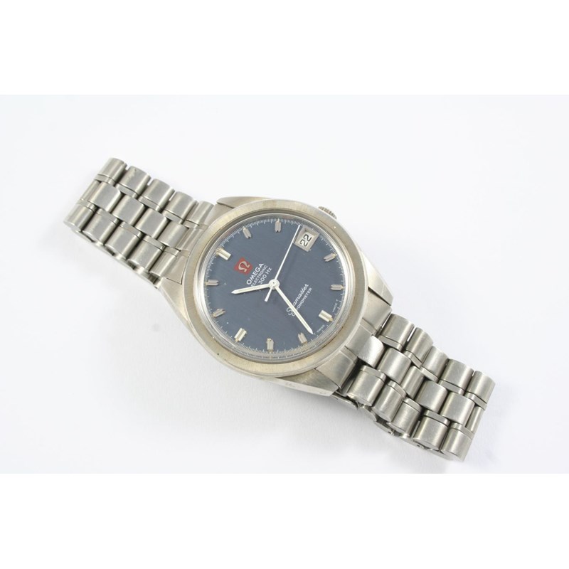 the signed grey dial with baton numerals and date aperture, on an Omega stainless steel bracelet, 38mm dia