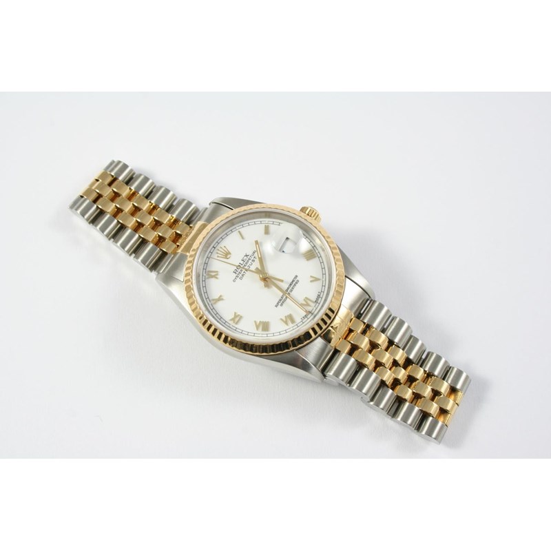 the signed white dial with Roman numerals, on a Rolex bracelet with deployant clasp, serial number W577167, model number 16233, 35m dia.
