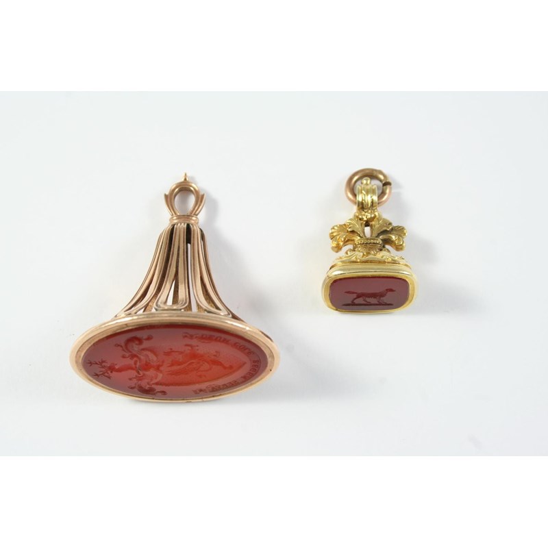 A 19TH CENTURY GOLD SEAL with foliate scrolling body, the carnelian matrix engraved with a hound, 2.5cm high, together with another gold seal, the carnelian matrix engraved with a crest, 4cm high