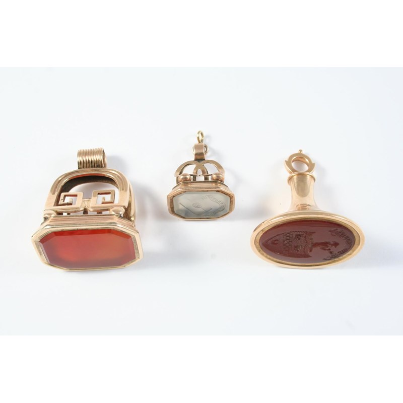 one with carnelian matrix engraved with a coat of arms, 3.7cm high, one with a vacant carnelian matrix, 4cm high and one with a chalcedony matrix engraved with initials and motto, 2.5cm high