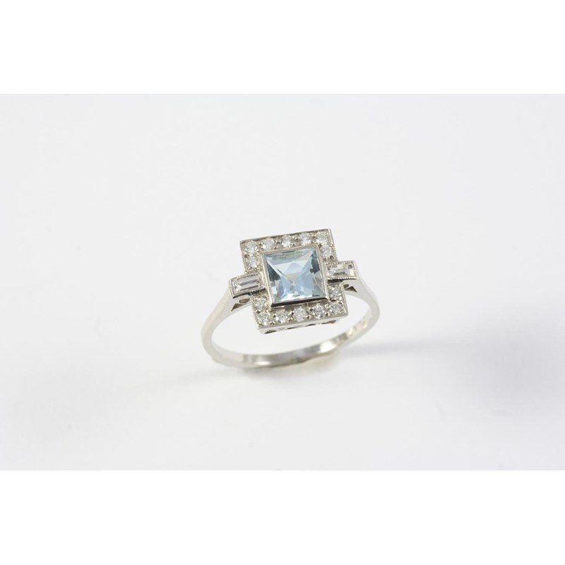AN AQUAMARINE AND DIAMOND CLUSTER RING the square-shaped aquamarine is set within a surround of two baguette-cut and fourteen circular-cut diamonds in platinum. Size N