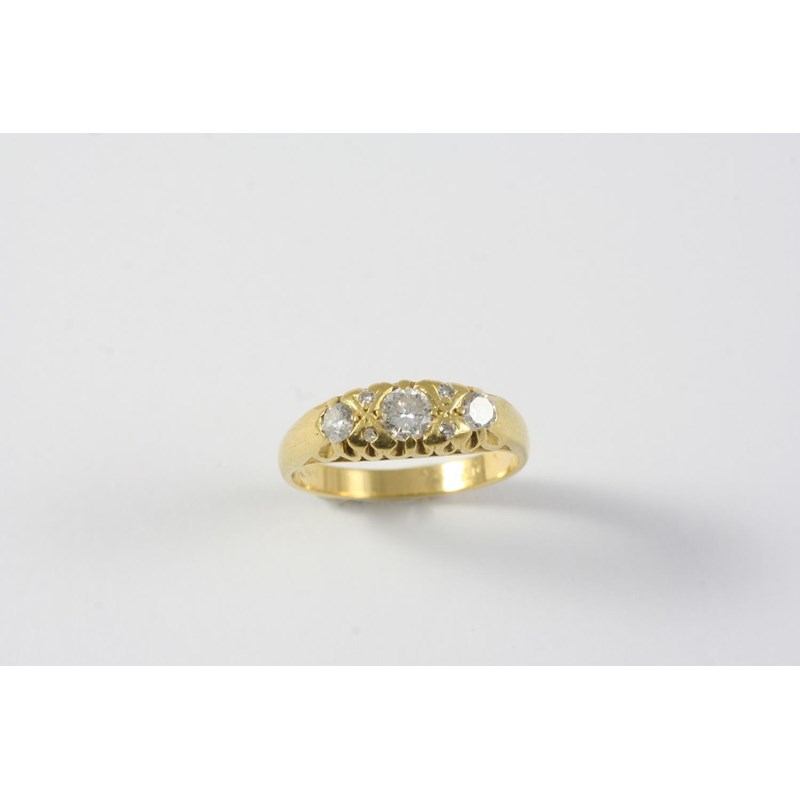A DIAMOND THREE STONE RING the three graduated circular-cut diamonds are set with circular diamond highlights in 18ct gold. Size M 1/2