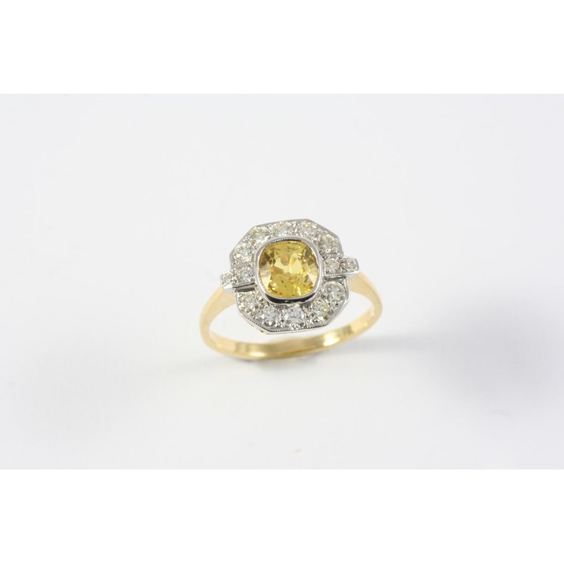 A YELLOW SAPPHIRE AND DIAMOND CLUSTER RING the oval-shaped yellow sapphire is set within a surround of circular-cut diamonds, in 18ct gold. Size M