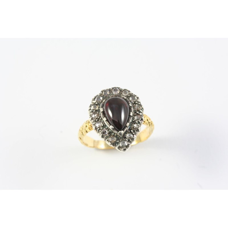 A GARNET AND DIAMOND PEAR-SHAPED CLUSTER RING the pear-shaped cabochon garnet is set within a surround of circular-cut diamonds, in gold. Size L
