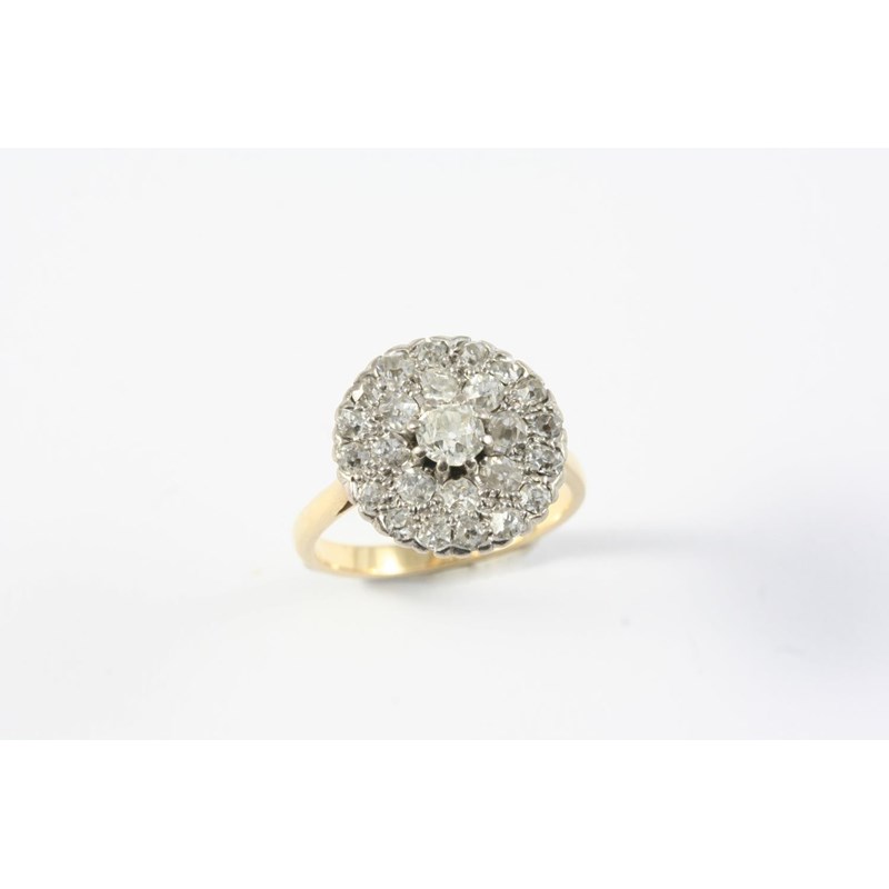 A DIAMOND CLUSTER RING centred with a circular old-cut diamond within a double surround of millegrain set old-cut and rose-cut diamonds, in gold. Size L