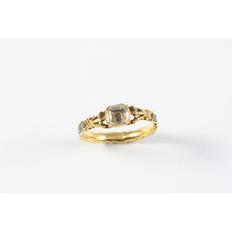 the cushion-shaped rock crystal is set in gold closed back setting, with foliate decoration to the trifurcated shoulders and black enamel decoration to the shank, with inscription for Ann Nicholson OB 23 Oct 1755 AE 41. Size M