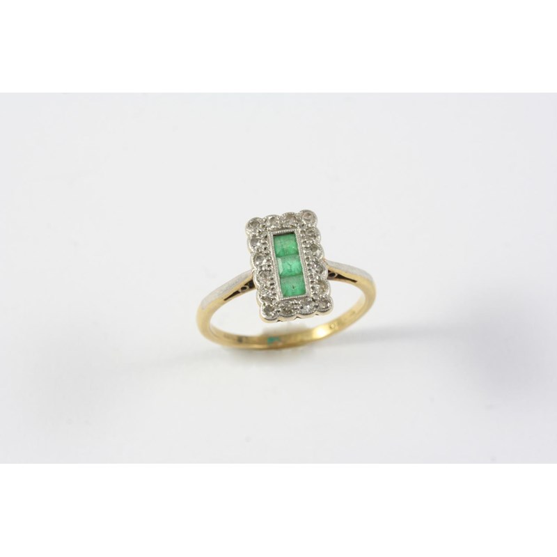 AN EMERALD AND DIAMOND CLUSTER RING the three calibre-cut emeralds are set within a surround of circular-cut diamonds, in gold. Size K