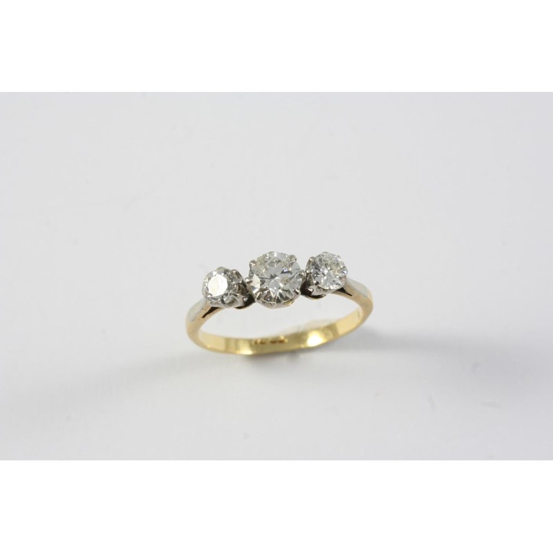 A DIAMOND THREE STONE RING the three graduated circular-cut diamonds are set in 18ct gold. Size M 1/2