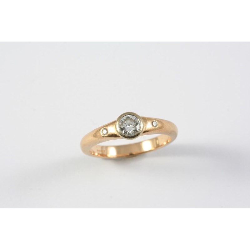 A DIAMOND SOLITAIRE RING the collet set circular-cut diamond is mounted with two small diamonds on an 18ct yellow gold band. Size P 1/2