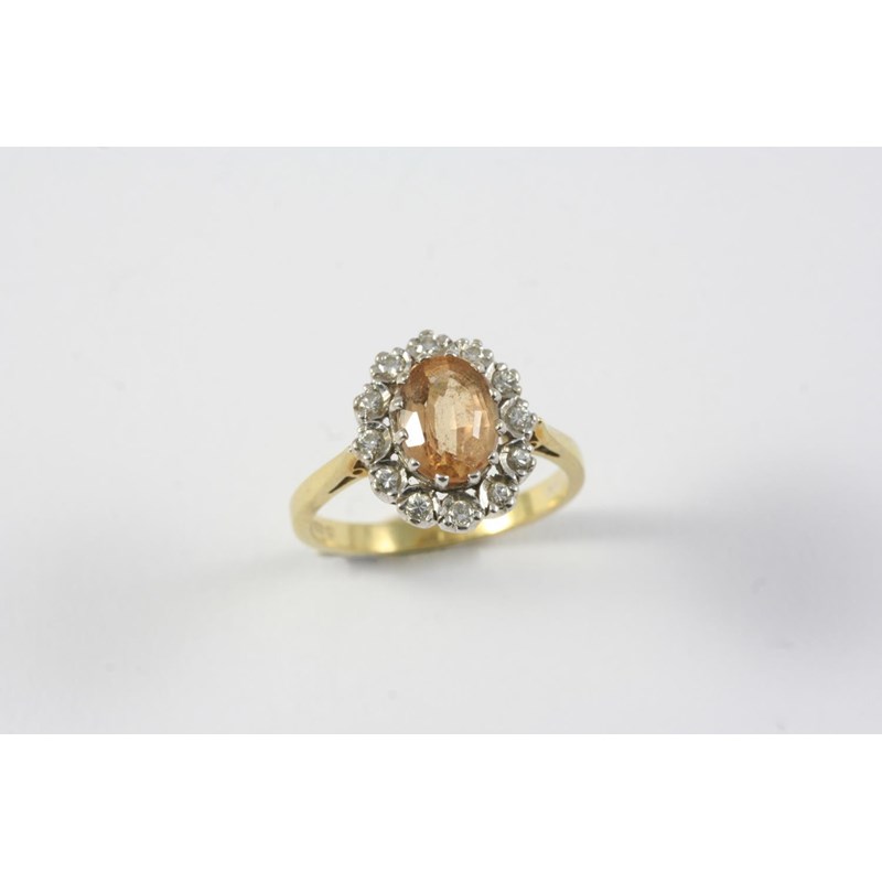 A TOPAZ AND DIAMOND CLUSTER RING the oval-shaped topaz is set within a surround of circular-cut diamonds, in 18ct gold. Size L