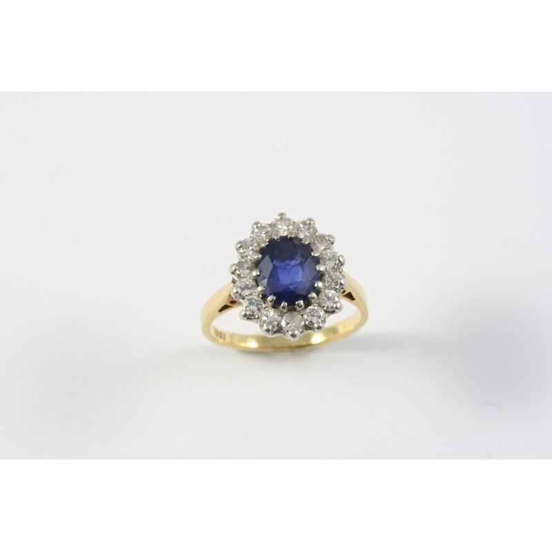 the oval-shaped sapphire is set within a surround of fourteen circular-cut diamonds, in 18ct gold and platinum. Size I