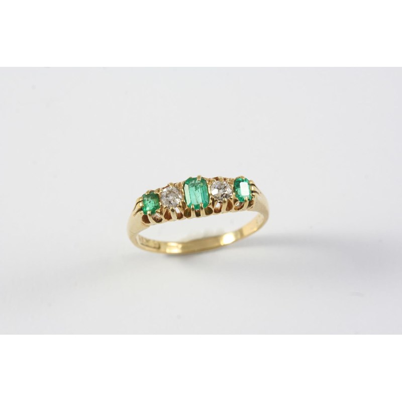 AN EMERALD AND DIAMOND FIVE STONE RING the three rectangular-shaped emeralds are set with two circular diamonds, in 18ct yellow gold. Size P